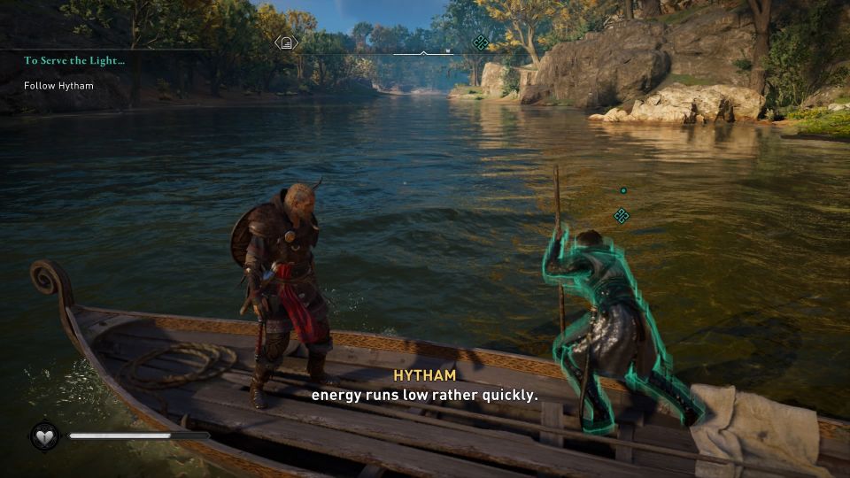 Your task is to follow Hytham as he teaches Eivor how to do the leap of faith.