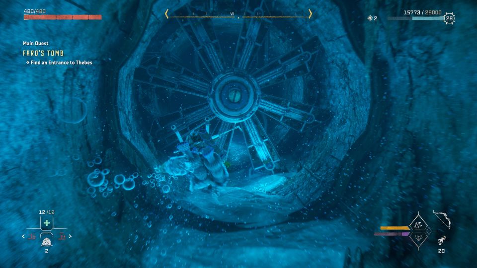 After going down with the rest of the crew, look for an entrance to Thebes. Dive underwater.