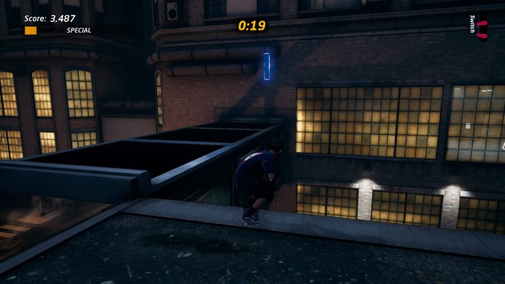 You have to get into ‘Special Mode’, build some speed and jump off the ramp to the next building.